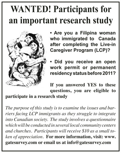 AFTER FINISHING LIVE-IN CAREGIVER PROGRAM By Mila Astorga-Garcia TORONTO–There is at present an important research survey seeking respondents in the Filipino community, particularly those who… 10/11/2013